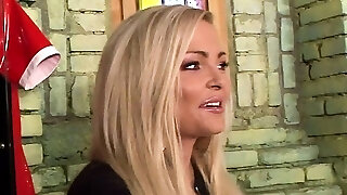 blonde latex nurse investigates her blond patient with enema, speculum and suction cups