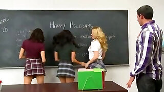 Super-steamy blondes seducing a teacher into porking them in the empty classroom