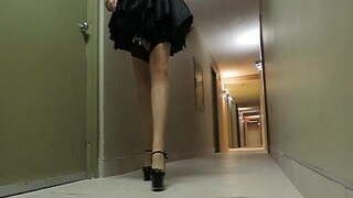 Sissy Ray in hotel corridor wearing maids uniform