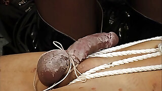 Mistress in latex gloves masturbates a naked, tied up guy