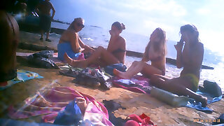 Upshorts dick flash for group of femmes on beach