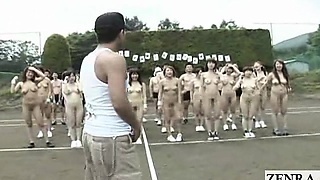 Subtitled Japanese nudist CMNF outside group stretching